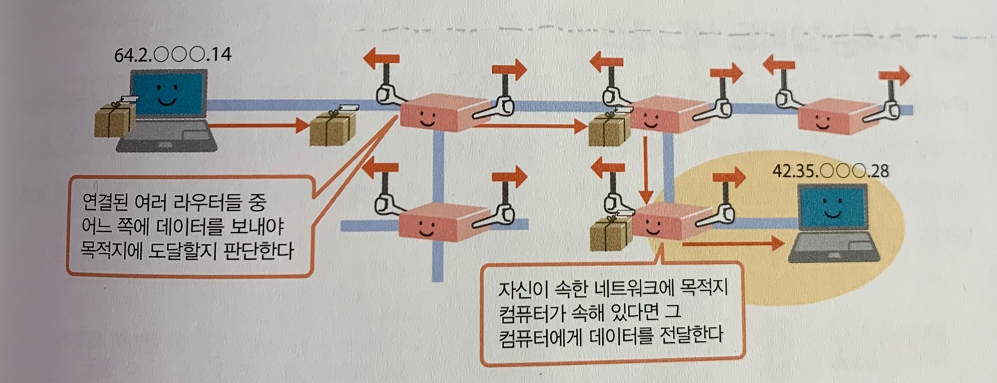 ๋ค์์ผ๋ก ์ธํฐ๋ท ๊ณ์ธต์ IP์ ๋ํด์ ์์๋ณด์. ์ธํฐ๋ท ๊ณ์ธต์ ๋ค๋ฅธ ์ปดํจํฐ์๊ฒ ๋ฐ์ดํฐ๋ฅผ ์ ๋ฌํ๋ ์ญํ ์ ํ๋ค. ์ด๋ IP Address๋ผ๊ณ ํ๋ ์๋ณ์ ์ ๋ณด๋ฅผ ์ค๋ง๋ฆฌ๋ก ๋ฐ์ดํฐ๋ฅผ ์ ๋ฌํ ์ ์๋ ์ฒด๊ณ๋ฅผ ์ ๊ณตํ๋๋ก ์ญํ ์ด ๊ฐ๊ฐ ๊ตฌ๋ถ๋์ด ์๋ค. ๋ฐ์ดํฐ๋ฅผ ๋ชฉ์ ์ง๊น์ง ์ ๋ฌํ๊ธฐ ์ํด์๋ ๋ผ์ฐํฐ(router)๋ผ๊ณ ํ๋ ๋คํธ์ํฌ ์ฅ๋น๊ฐ ํ์ํ๋ค. ๋ผ์ฐํฐ๋ ๋คํธ์ํฌ์ ๋คํธ์ํฌ๋ฅผ ์ฐ๊ฒฐํ๋ ์ญํ ์ ํ๋๋ฐ, ํ๋์ ๋ผ์ฐํฐ๋ ๋ฐ์ดํฐ๋ฅผ ๋ชฉ์ ์ง๊น์ง ์ ๋ฌํ๊ธฐ ์ํด ๋ค์ ๋คํธ์ํฌ์ ๊ฒฝ๋ก๋ฅผ ์ฐพ๊ณ , ๊ทธ ๊ฒฝ๋ก์์ ์๋ ๋ผ์ฐํฐ์๊ฒ ๋ฐ์ดํฐ ์ ๋ฌ์ ์์ํ๊ฒ ๋๋ค. ์ต์ข