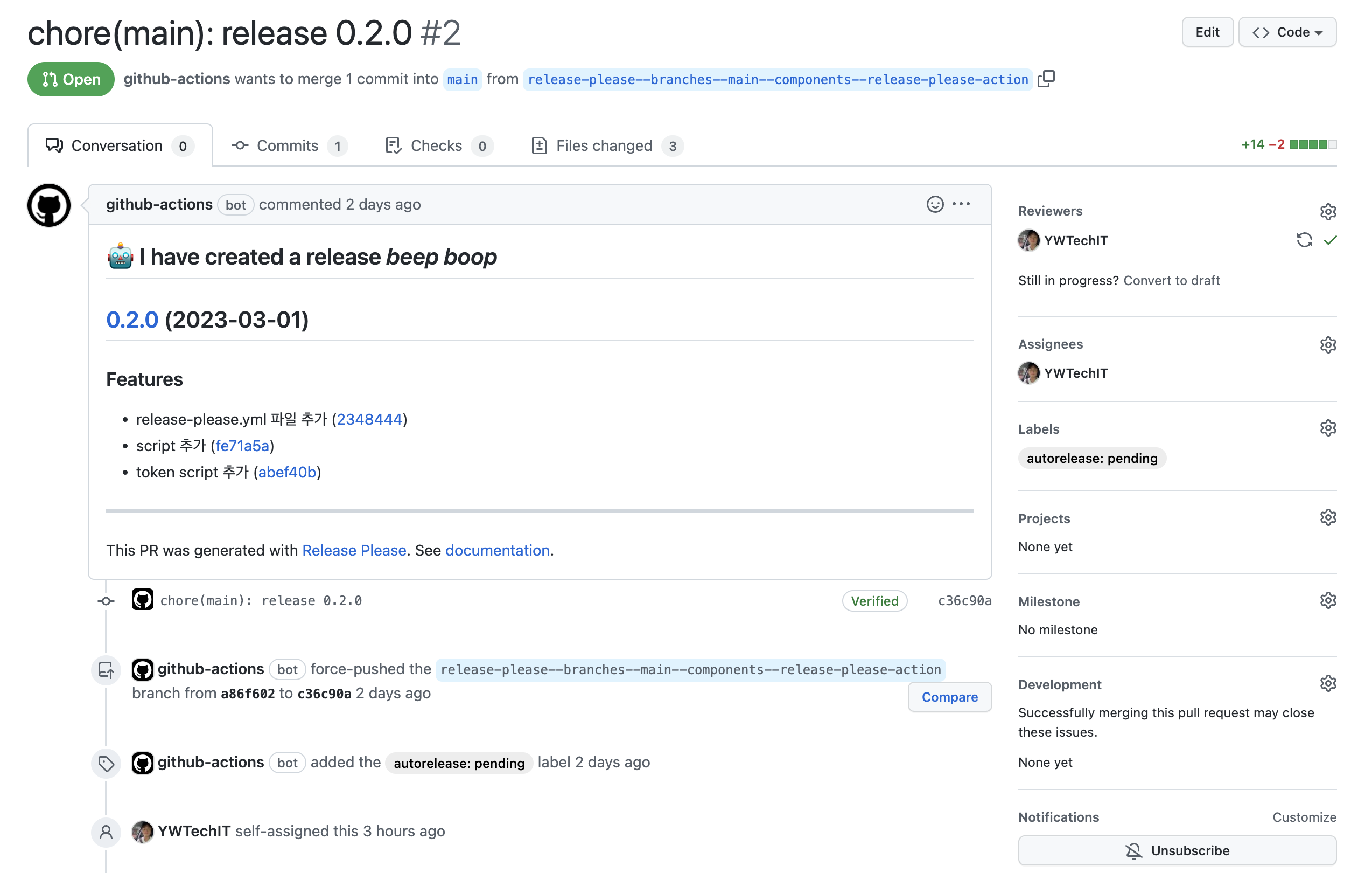 우선, release-please를 setting하려면 3가지 방법이 있습니다. (GitHub Action(recommended), Running as CLI, Install the GitHub App) 이 중 recommended인 GitHub Action을 선택했습니다. 이제 .github/workflows/release-please.yml을 추가하면 main branch에 push 될 때마다 동작합니다. (Configuration은 release-please-action을 참고해주세요!)