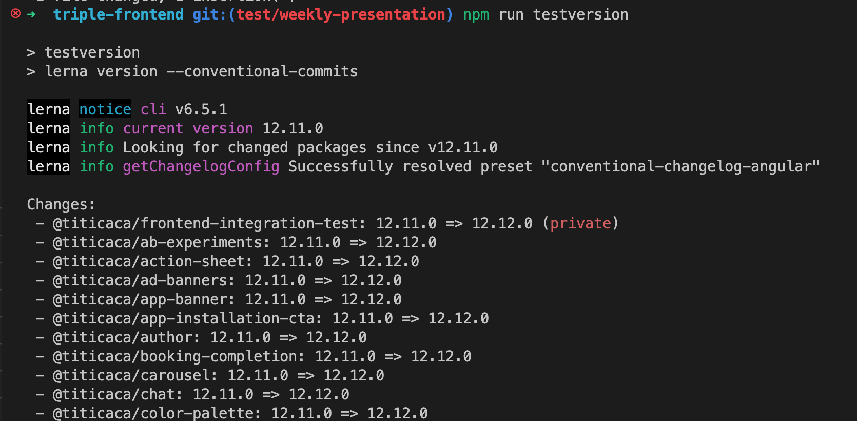 TF의 npm run version 커맨드는 lerna version --no-push --force-publish script를 사용하고 있었으므로 이와 비슷한 두 번째 방법을 사용해봅시다.